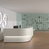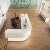 The reception desk is iconic and functional. It is designed to be used in a professional setting with the goal of offering a high-quality surface for customer interactions, while also minimizing the amount of space taken up. The desk is finished by laminated melamine, which makes it easy to maintain and clean. The design includes wire management grommets as well as tempered glass panels to protect against direct light flare.